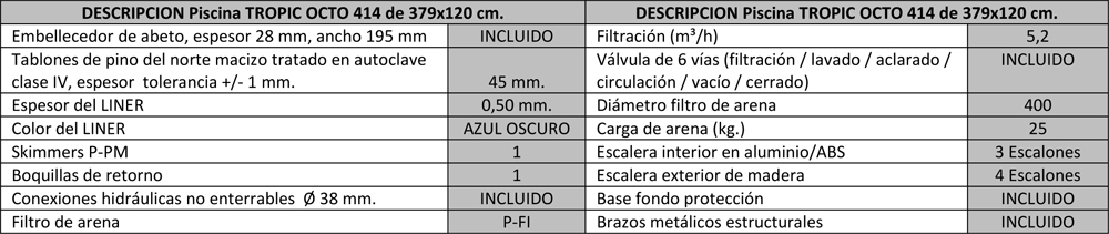 LA PISCINA TROPIC OCTO 414 DE 379x120 CM. SE ENVIA EN 2 PALETS DE 644 Kg.